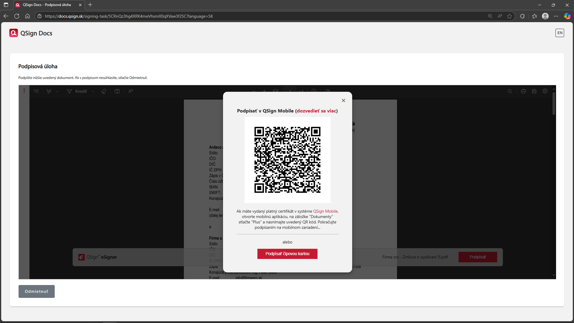 Dokumenty je možné podpísať cez QSign Mobile alebo čipovou kartou.